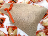 Jutesäckchen, standardmäßig in braun, verschlossen mit Taftband oder