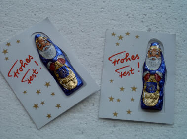 verpackt in bunt bedruckter Stanniolfolie, aufgebracht auf einem
